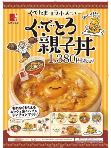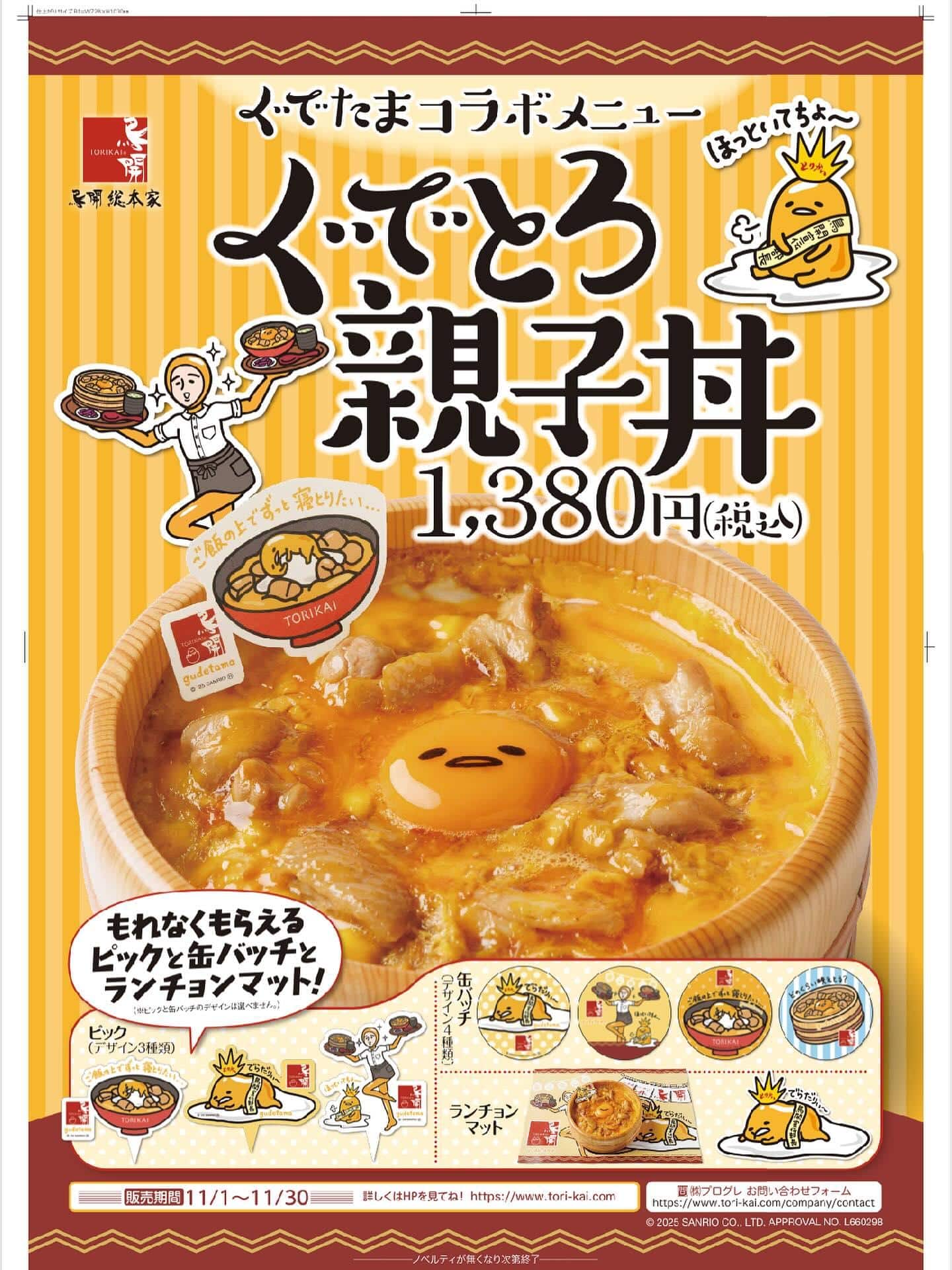 11月1日(土)~11月30日(日)の期間「<鳥開 総本家> × ぐてたま」 のスペシャルキャンペーンを開催。 ぐでたまコラボメニュー「ぐてとろ親子丼」をご注文いただくと、 フードピック(全3種・ランダム)とランチョンマットが付いてきます。 さらに、缶バッジ{全4種・ランダム)のプレゼントをいたします。 名古屋弁や、親子丼の上でくつろいだりする ぐでたまがかわいいデザインとなっています。 皆さまのご来店を心よりお待ちしております。 ◆ぐでたまコラボメニュー「ぐてとろ親子丼」 税込 1,380円 ※ノベルティはなくなり次第終了となります。予めご了承ください。